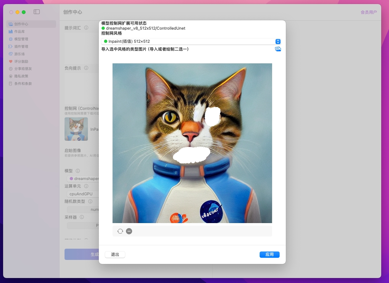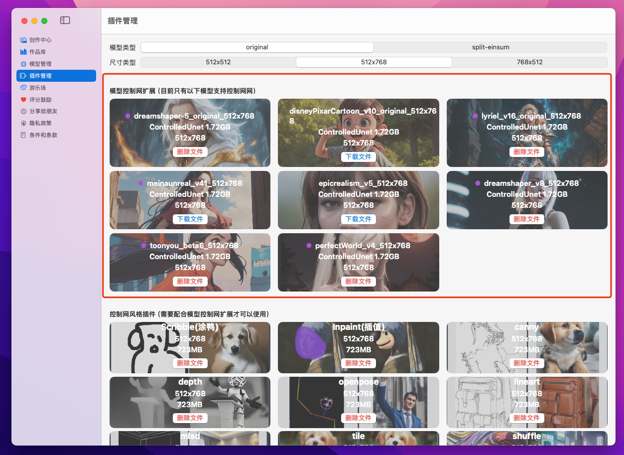 When you have installed the corresponding plugins, you can use ControlNet in the Creative Center. As shown in the image below, when both plugins display a green indicator, it signifies that the plugins have been recognized (if a downloaded plugin isn't recognized, try closing and reopening the app; this issue occasionally occurs). Currently, JoyFusion supports in-app editing for Scribble and InaPaint (interpolation) styles. For other styles, such as generating line art images via online services like "Photograph to Pattern" (https://online.rapidresizer.com/photograph-to-pattern.php) or converting to skeletal images via "OpenPose AI" (https://openposeai.com/), third-party functionality is needed. Once you submit an entry for a ControlNet-specific style image, it will take effect. JoyFusion also supports blending multiple ControlNet styles.